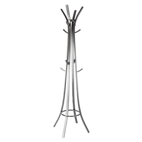 Durable metal and a sleek silver finish adds versatility and longevity to this fine coat stand. This metal coat rack has a sleek, silver finish for a modern aesthetic. Ring at the base to use as an umbrella holder. To make room for all your scarves, hats and jackets, you need a solid and stylish coat rack. <p>give guests a warm welcome when you place this contemporary style metal coat rack in your hall or entryway, or make the most of a compact space by tucking one into a corner of your living room, bedroom, mudroom, or home office.